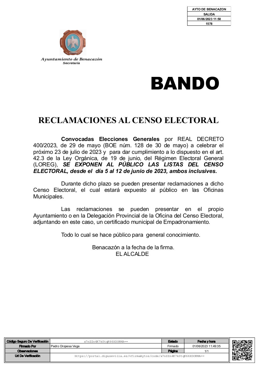 El Ayuntamiento de Benacazón informa que, convocadas ELECCIONES GENERALES por REAL DECRETO 400/2023, de 29 de mayo (BOE núm. 128 de 30 de mayo) a celebrar el 23 de julio de 2023, SE EXPONEN AL PÚBLICO LAS LISTAS DEL CENSO ELECTORAL, desde el día 5 al 12 de junio de 2023, ambos inclusives.
