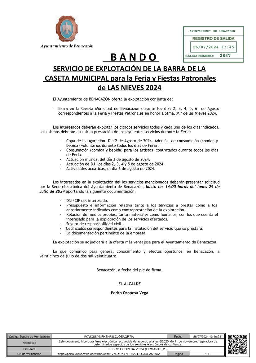 BANDO "SERVICIO DE EXPLOTACIÓN DE LA BARRA DE LA CASETA MUNICIPAL Feria y Fiestas Patronales LAS NIEVES 2024