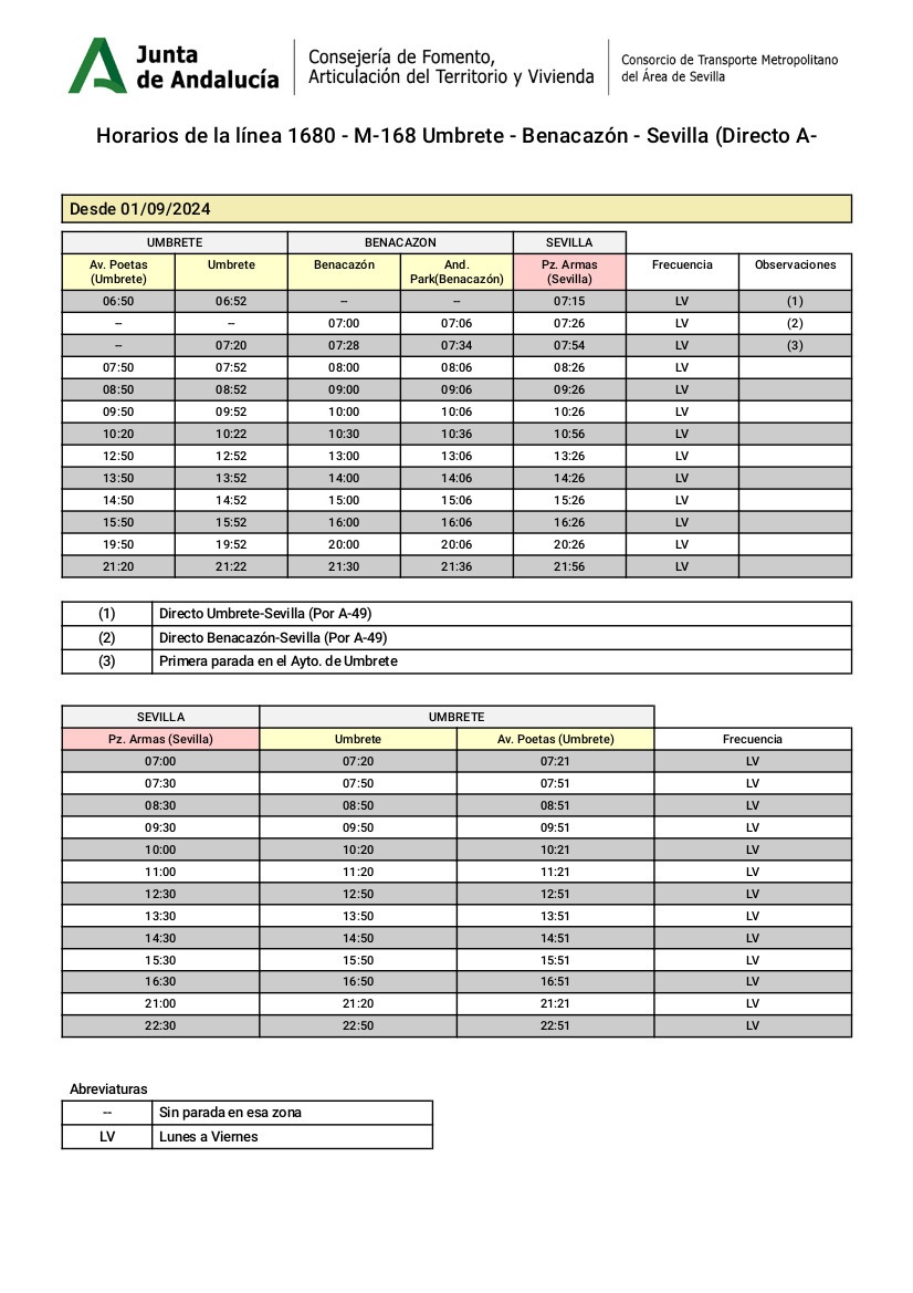 El Ayuntamiento de Benacazón informa que desde el 1 de Septiembre la línea de autobuses metropolitanos M-168 Benacazón-Sevilla modifica sus horarios, con motivo de la entrada en vigor de los horarios de inverno 2024/2025: