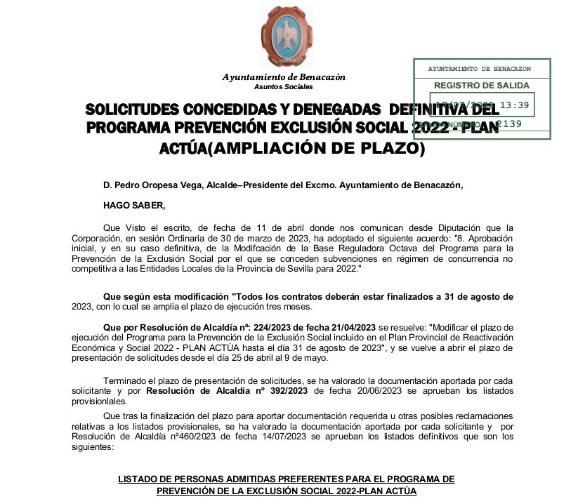 El Ayuntamiento de Benacazón publica el listado definitivo de SOLICITUDES ADMITIDAS y DENEGADAS DEL PROGRAMA PREVENCIÓN EXCLUSIÓN SOCIAL 2022 - PLAN ACTÚA (ampliación de plazo).