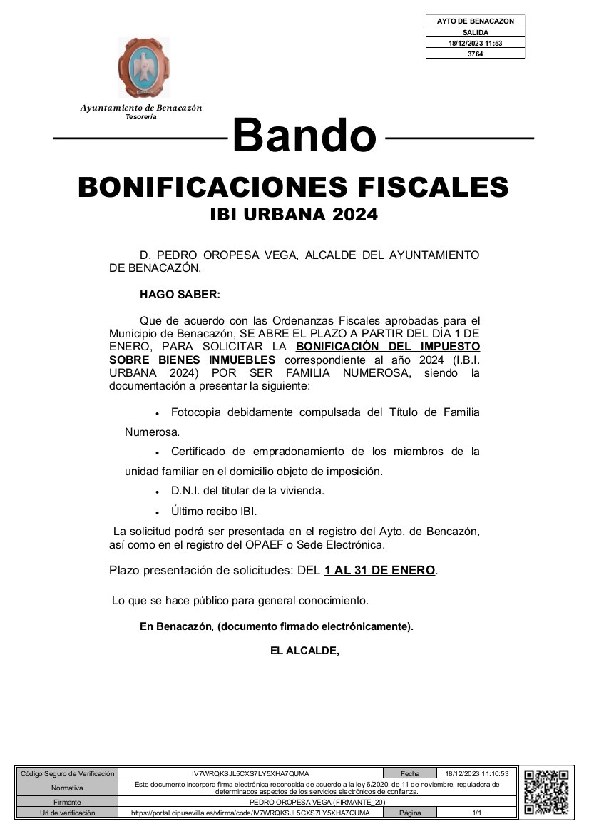 BANDO BONIFICACIONES FISCALES I.B.I. URBANA 2024 FAMILIAS NUMEROSAS