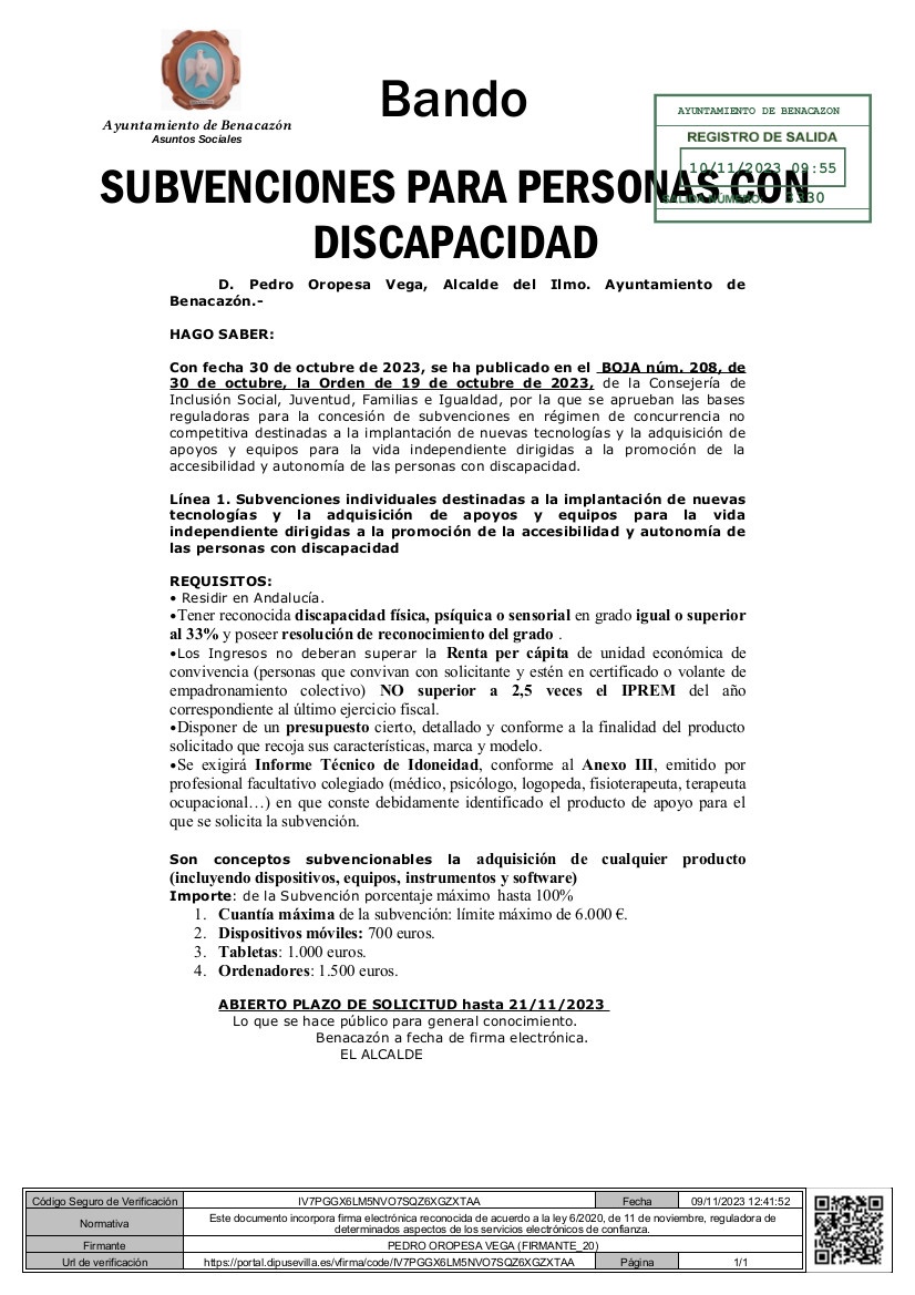 BANDO: 'SUBVENCIONES PARA PERSONAS CON DISCAPACIDAD'. PLAZO DE SOLICITUD HASTA EL 21/11/2023