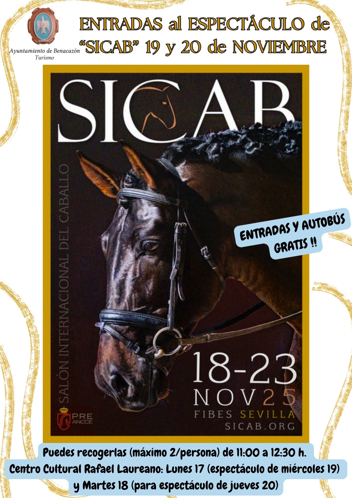 El Ayuntamiento de Benacazón informa que, por gentileza de la Delegación municipal de Turismo, se van a repartir 70 invitaciones (distribuidas entre los dos días) para asistir al Espectáculo del Salón Internacional del Caballo SICAB 2025 del miércoles 19 y jueves 20 de noviembre a las 20:00 h. en FIBES. Para el desplazamiento, se dispondrá de AUTOBÚS GRATUITO, que saldrá a las 17:30 de la parada del Colegio Talhara.