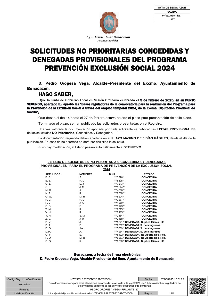 El Ayuntamiento de Benacazón informa que, una vez valorada la documentación aportada por cada solicitante del PROGRAMA de PREVENCIÓN EXCLUSIÓN SOCIAL 2024, se publican las LISTAS PROVISIONALES de las solicitudes NO Prioritarias, Concedidas y Denegadas.