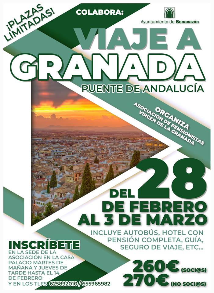 VIAJE A GRANADA EN EL PUENTE DE ANDALUCÍA (DEL 28/02 AL 3/03) ORGANIZADO POR LA ASOCIACIÓN DE PENSIONISTAS ''VIRGEN DE LA GRANADA''. INSCRIPCIONES MARTES Y JUEVES (DE 11:30 A 13:00 H.) EN LA SEDE HASTA EL 14 DE FEBRERO