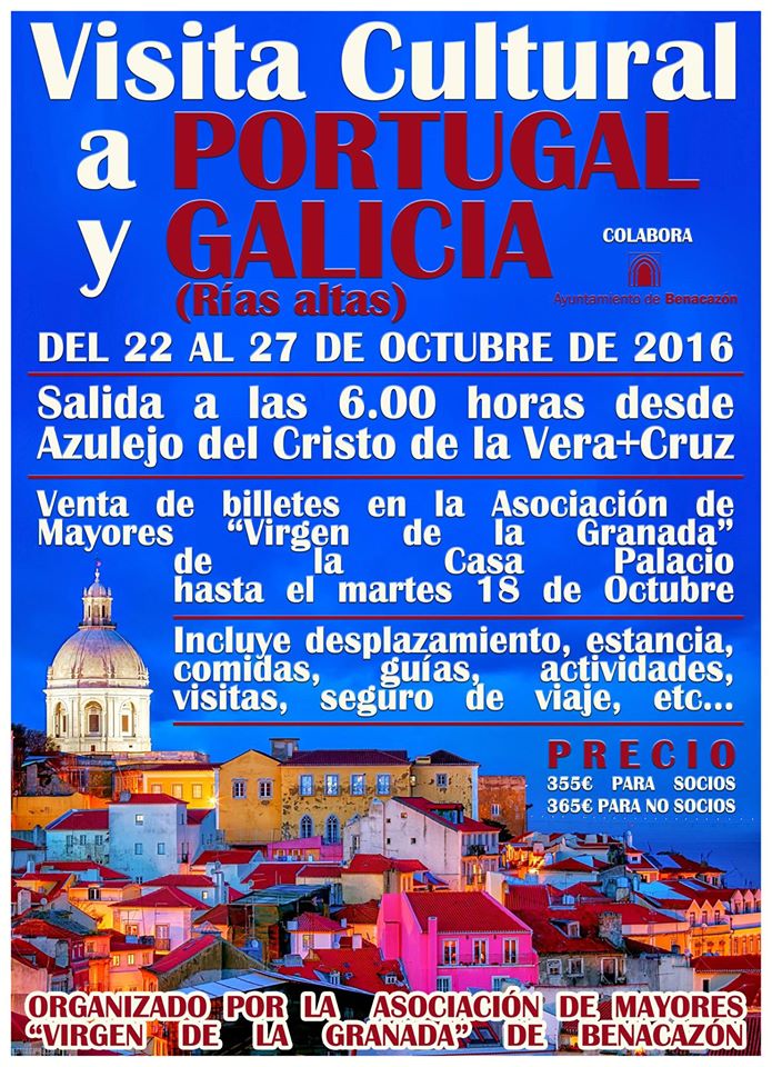 VISITA CULTURAL A PORTUGAL Y GALICIA (RÍAS ALTAS) DEL 22 AL 27 DE OCTUBRE, ORGANIZADA POR LA ASOCIACIÓN DE PENSIONISTAS VIRGEN DE LA GRANADA. INSCRIPCIONES HASTA EL DÍA 18 EN LA SEDE DE LA ASOCIACIÓN